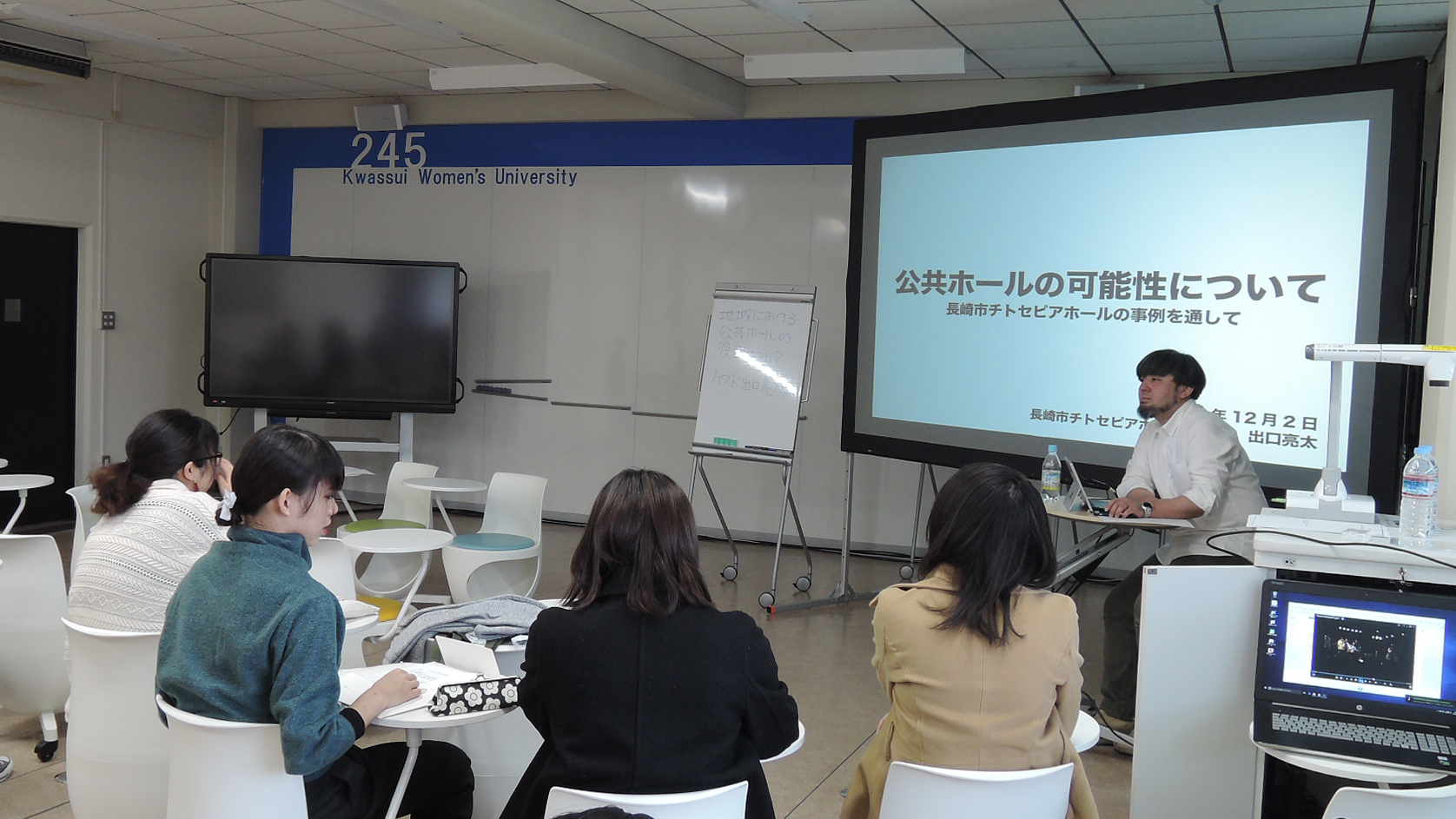 12月2日、館長の出口が活水女子大学で講義を実施しました。地域とホールの関わりや公共文化施設の使命について、自主事業の展開と関連付けながらお話させていただきました。