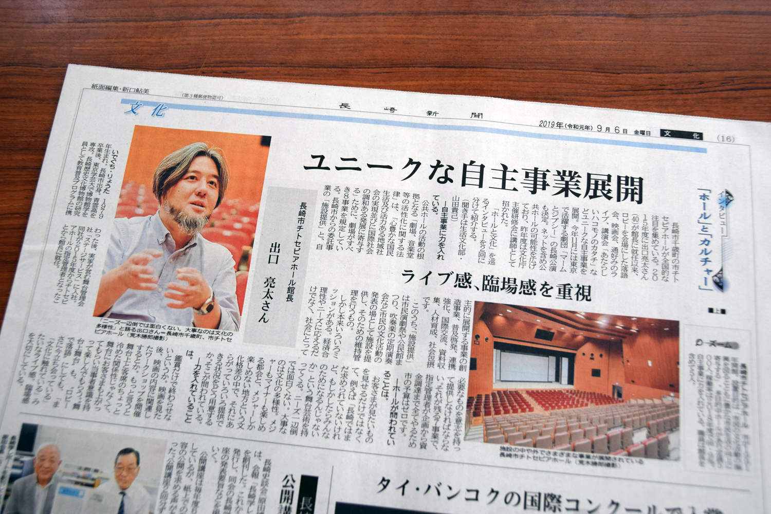【メディア掲載情報】9月6日付の長崎新聞で当ホールをご紹介いただきました。 9月6日付の長崎新聞にて地域の公共ホールが自主事業に取り組む意義というテーマで、チトセピアホールの事業運営について特集いただきました。本特集は二回シリーズで後編も近日掲載の予定です。ぜひご一読ください。