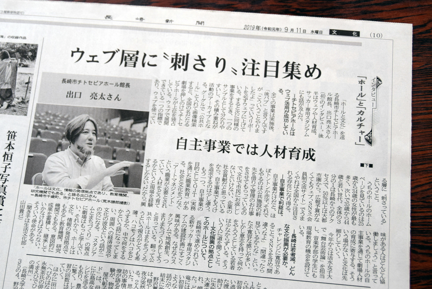 9月11日付の長崎新聞にてチトセピアホールの事業運営について特集いただきました。本稿は二回シリーズの後編で(前編についてはこちらをご覧ください)、公共ホール運営におけるwebの活用と人材育成、まちづくりとの関連性についての記事となっています。ぜひご一読ください。