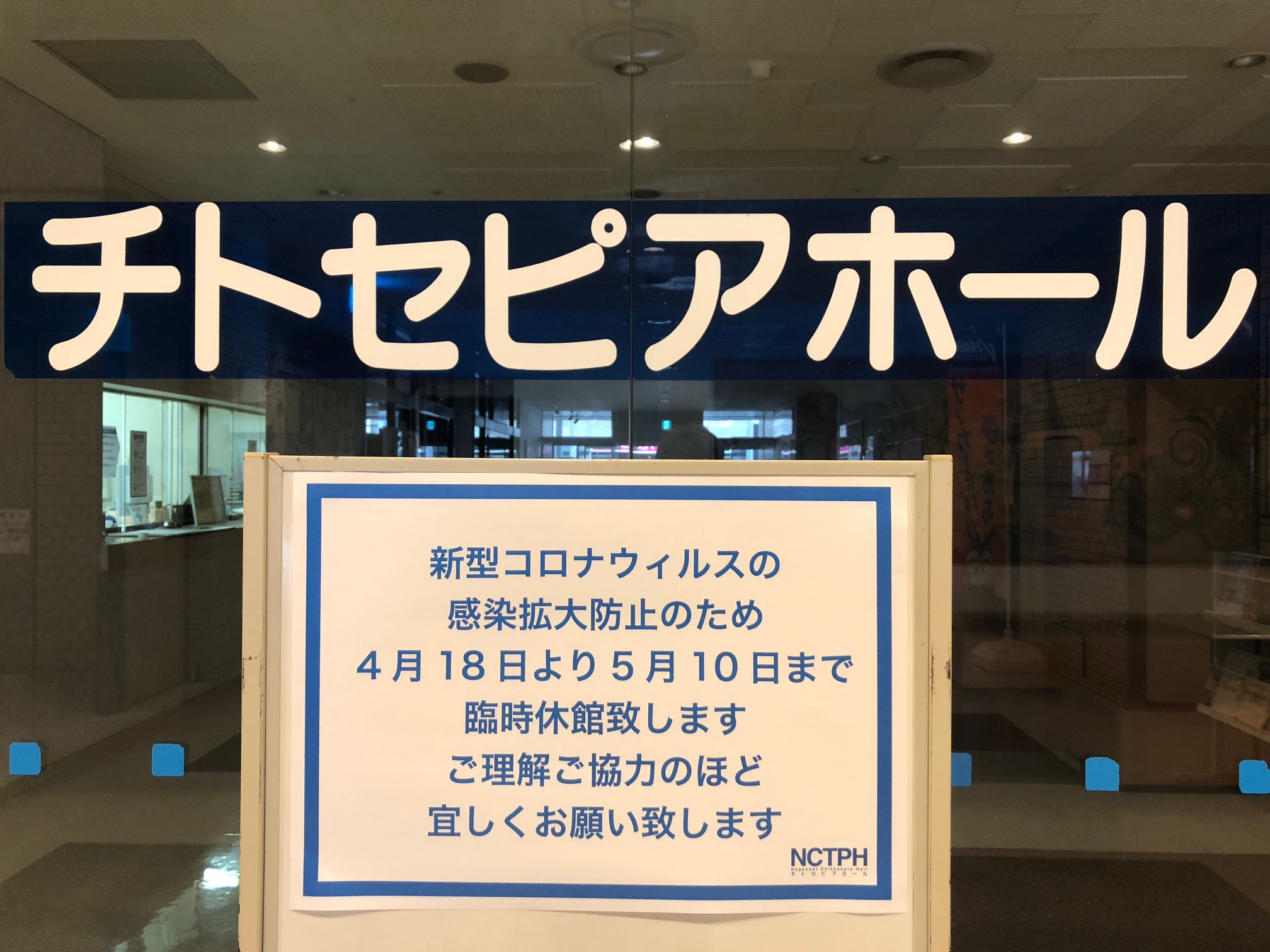 【重要】休館のお知らせ(2020.5.6更新) 長崎市チトセピアホールは新型コロナウィルス感染拡大防止のため下記の期間、臨時休館いたします。 ■期間 令和2年4月18日(土)~5月10日(日) *当初のお知らせより期間を延長しました ■休館中のお問合せ 電話:095-842-2700(受付時間:9:00~17:30) なお、上記の観点から新規での利用予約も令和2年5月31日(日)までは受け付けできません。 ご理解ご協力の程よろしくお願いいたします。