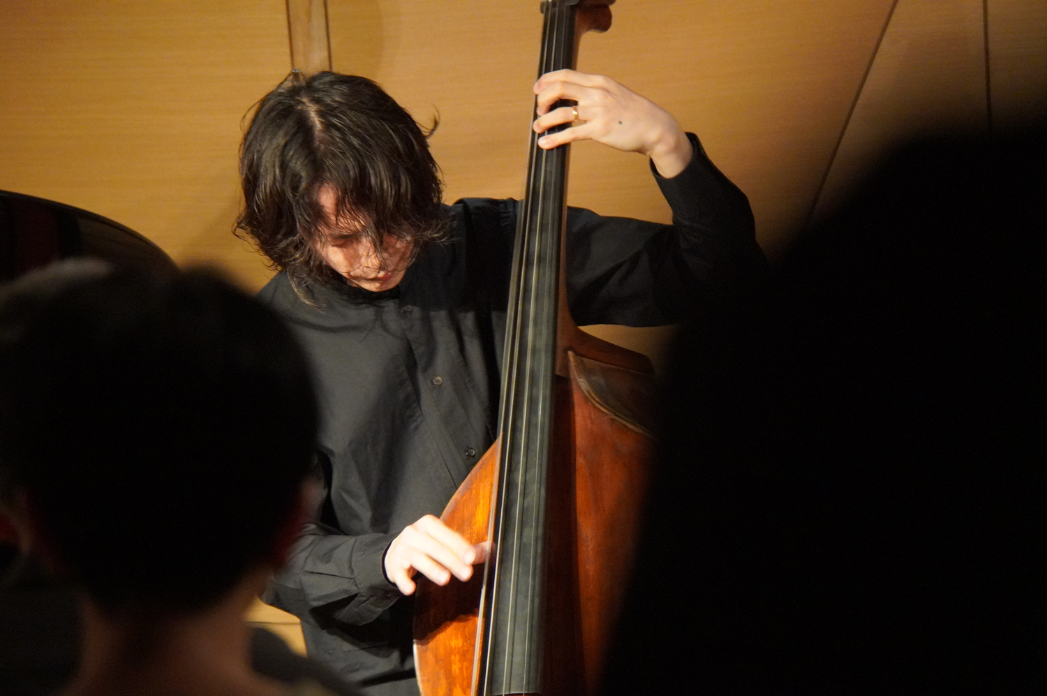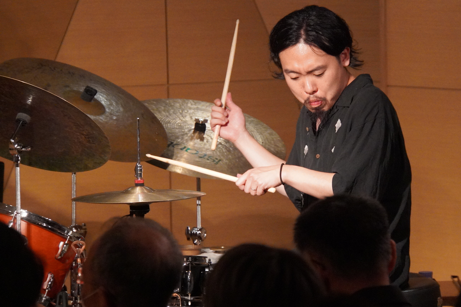 石若作曲の “April Fools”では、目まぐるしく変わるリズムのなかで遊んでいるかのような、それぞれのプレイがカオティックにこんがらがったかと思えば絶妙なタイミングでピタリと合わさる、まさに自由で自在な3人のテクニックが堪能できました。