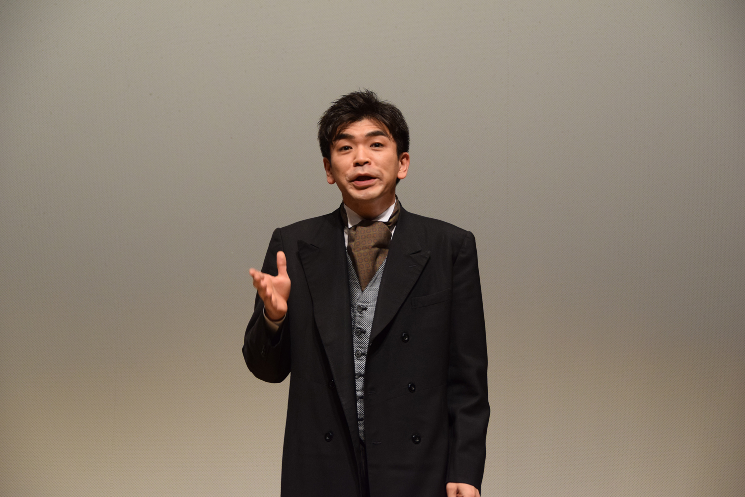 開演時間が少し過ぎた頃、拍手の中をフロックコートに身を包んだ頼光さんが登場。無声映画と活動弁士の説明からスタートです。