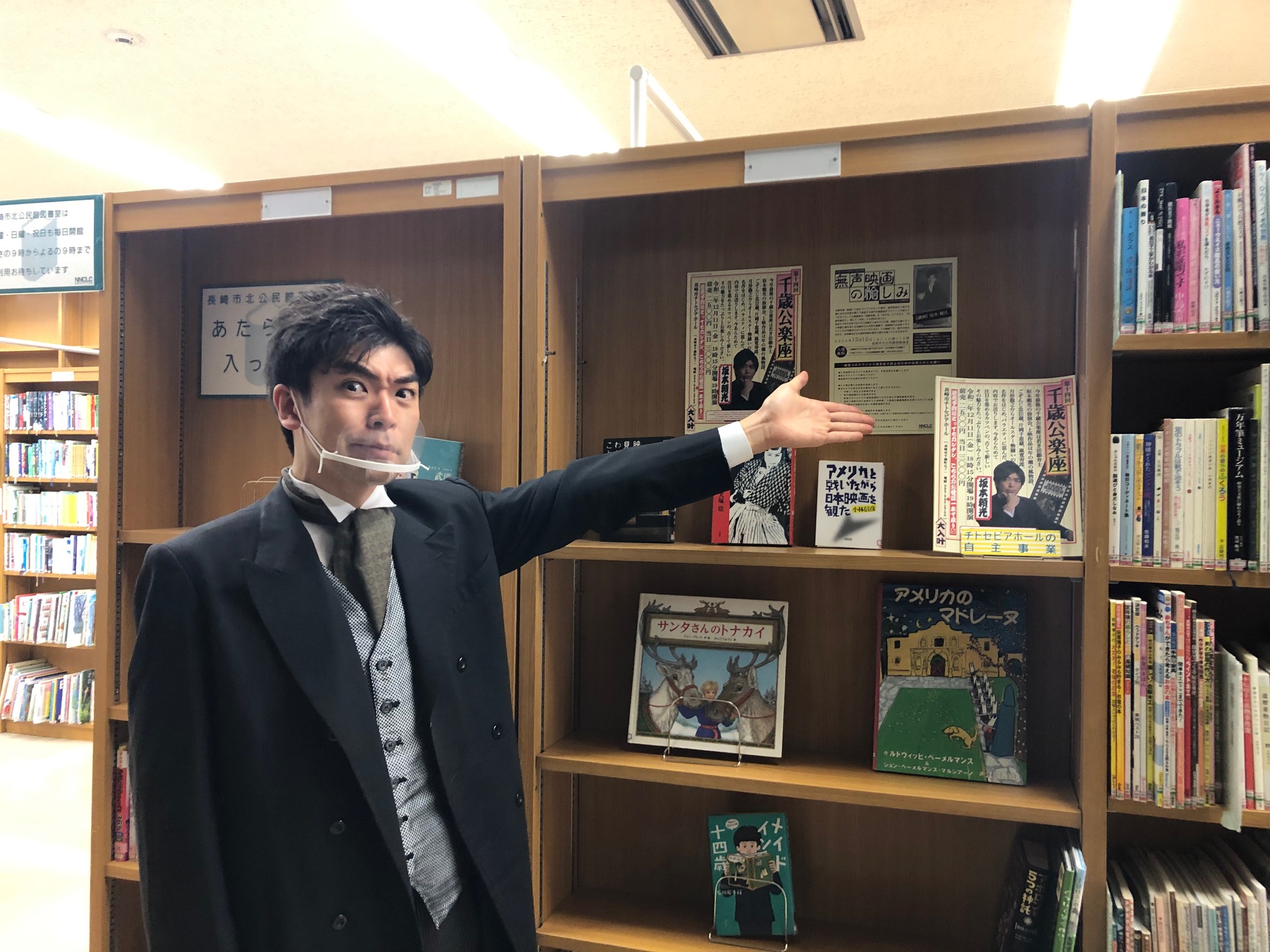 図書室では公演と講座にちなんで日本映画についての特設コーナーを展開。頼光さんをお迎えしての記念撮影をパチリ。