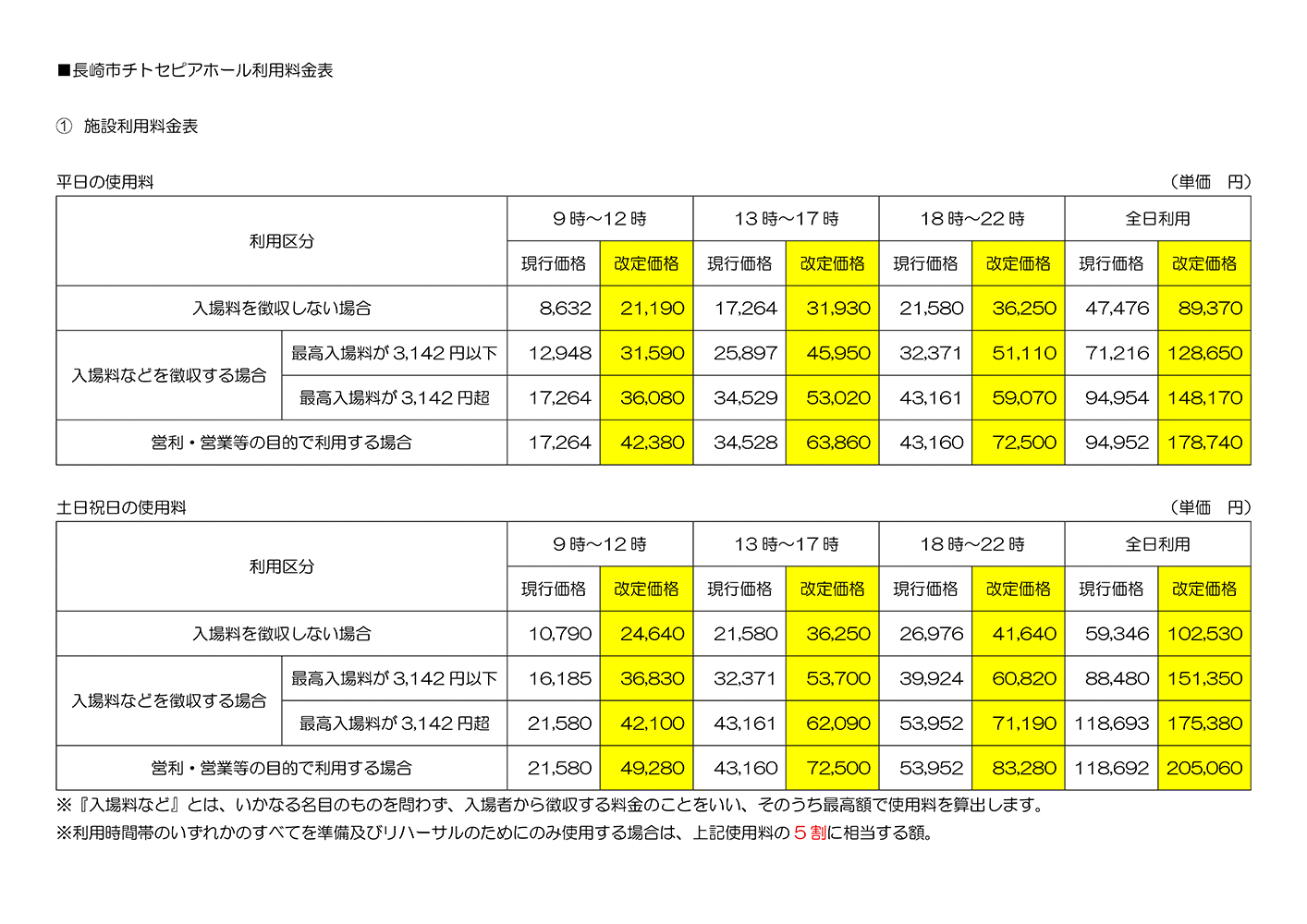 *ベネックス長崎ブリックホールは令和8年3月30日(月)まで、長崎市チトセピアホールは令和8年3月31日(火)までに各施設の利用申込書を提出した利用予約を現行価格とします。
