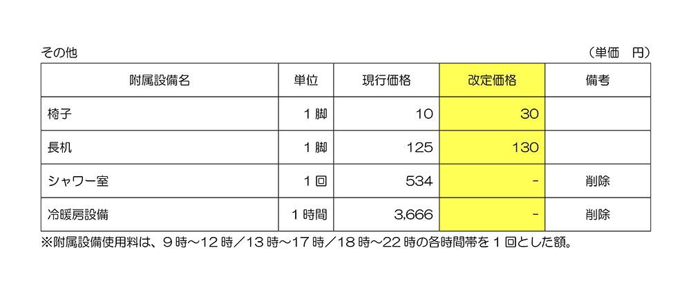 このようなことから、施設利用者とそうでない方の負担割合のバランスを保つために、今回、使用料を改定することになりました。